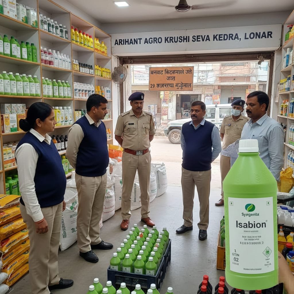 लोणार,(प्रतिनिधी): शेतकऱ्यांच्या शेतीवर थेट परिणाम करणाऱ्या बनावट कृषी औषधांच्या विक्रीचा गोरख धंद्याचा गंभीर प्रकार लोणार शहरात नुकताच उघडकीस आला. अरिहंत ॲग्रो कृषी सेवा केंद्र (लोणार) येथे होणाऱ्या सिंजेता कंपनीच्या नावाने बनावट इसाबेन (१ लिटर) या औषधांची विक्रीचा पोलीस व कृषी विभागाच्या पथकाने पर्दाफाश केला. या कारवाईत २९ हजार ८ रुपयांचा मुद्देमाल जप्त करण्यात आला असून कृषी सेवा केद्र चालकाविरुध्द गुन्हा दरखल करण्यात आला आहे.