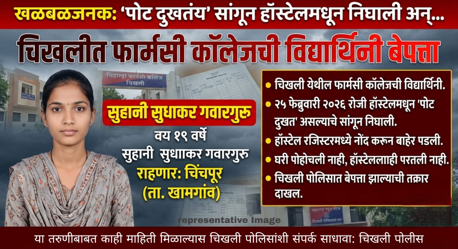 चिंचपूर (ता.खामगाव) येथील रहिवासी असलेली सुहानी सुधाकर गवारगुरु (वय १९ वर्षे) ही तरुणी चिखली येथील एका फार्मसी कॉलेजमध्ये शिक्षण घेत असून कॉलेजच्याच हॉस्टेलमध्ये वास्तव्यास होती. सुहानीने आपले पोट दुखत असून मला विश्रांतीसाठी घरी जायचे आहे, असे हॉस्टेल प्रशासनाला कळवले आणि की, हॉस्टेलच्या ‘आउटगोइंग’ रजिस्टरमध्ये तशी नोंद करून आपली बॅग घेऊन ती बाहेर पडली. मात्र, सायंकाळ होऊनही ती आपल्या गावी चिंचपूर येथे पोहोचली नाही. सुहानी वेळेत घरी न पोहोचल्याने तिचे वडील सुधाकर विश्वनाथ गवारगुरु यांनी तिची विचारपूस सुरू केली. मात्र रात्र उलटूनही सुहानीचा काहीच पत्ता लागला नाही. पालकांनी तिच्या हॉस्टेलमध्ये फोन केला असता, ती दुपारीच निघाल्याचे त्यांच्याकडून सांगण्यात आले.नातेवाईक, मित्र-मैत्रिणी आणि ओळखीच्या सर्व ठिकाणी शोध घेऊनही सुहानीचा कोणताही ठावठिकाणा लागला नाही.